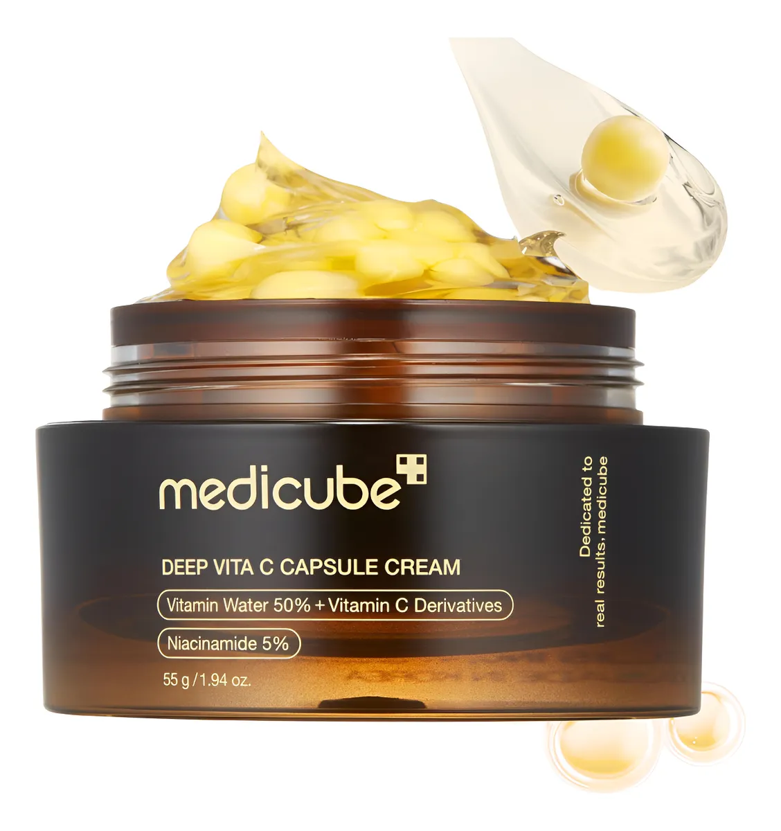 Medicube Deep Vita C Capsule Cream: Máxima frescura e iluminación. Sus microcápsulas liberan Vitamina C pura y Niacinamida al contacto con tu piel, eliminando el tono apagado y las manchas. ¡Brillo espectacular en cada aplicación!